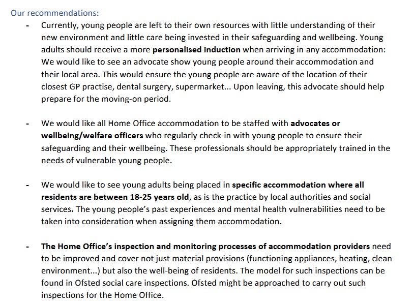 - too many contractors and subcontractors in the Home Office run asylum accommodation creates a fragmented system where information about individual needs is lost and holistic care is impossible; in particular, mental health vulnerabilities are routinely ignored and young people are placed in accommodation that is re-traumatising.